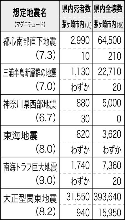 県内・茅ヶ崎市に最も甚大な被害があると想定された「大正型関東地震」は相模湾を震源とし、関東大震災の再来を想定。県内の死者を3万1550人と予測した。発生確率は30年以内にほぼ0〜5%とされ、湘南・県西地域を中心に震度7の揺れがあるとした。