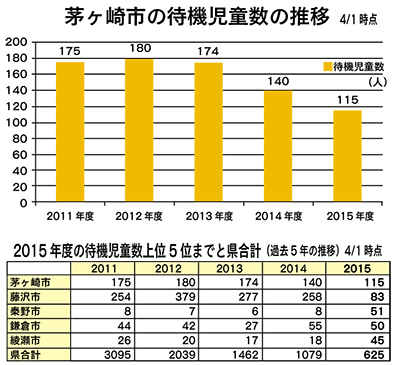 茅ヶ崎市でも対策として保育所の新設や増改築などの整備を進め、定員数も前年比395人増の2999人まで増やしたが、利用申込者数の増加が想定を上回り、待機児童数は前年比25人減にとどまった。
