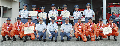 陸上の部「障害突破」は5人1組が協力し、「登る」「渡る」など災害現場の様々な障害を想定した訓練。同署から三戸裕明隊員、伊藤大輔隊員、田村徹士隊員、武富孝至隊員、福島康介隊員が出場し2位となった。