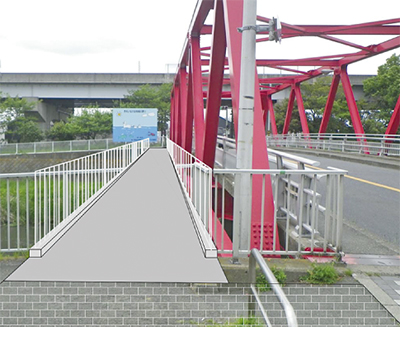 茅ヶ崎市では91年から歩道の整備事業を開始し、幅2m〜2・5mへの拡張と段差解消を行っている。「肥地力交差点」から西へ進み、現在は新鶴嶺橋の手前まで完了。トラス橋の構造上、橋の拡張が不可能なため人道橋を新設することになった。
