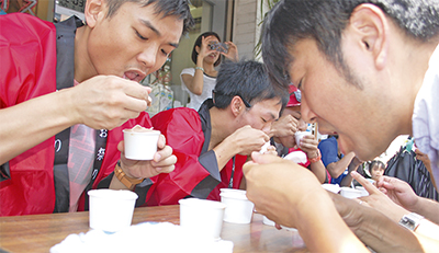 地域交流や街の賑わいを目的に行われた同大会は、5分間により多くのアイスを食べた人が優勝となる。4部門に分かれた参加者は炎天下の中、食べ進めるうちに「舌が麻痺する」「頭が痛い」と悪戦苦闘しながら楽しそうにチャレンジ。沿道に集まった約100人の観客から「頑張れ」など熱い声援が送られた。長谷川裕同店代表は「皆さんの笑顔が嬉しい。来年も開催します」と話した。