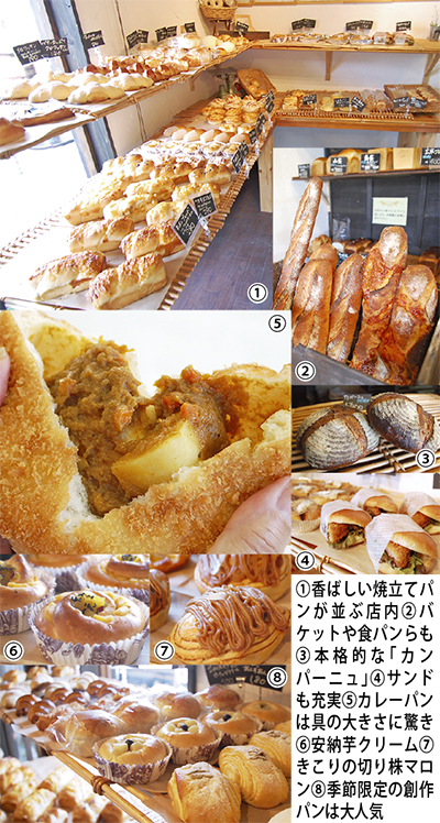 この秋は、実りの栗・芋・かぼちゃを使った新作「安納芋クリーム」「切り株マロン」「いもメロン」など豊富。定番のカレーパンも欠かせない。朝買ってもこんなにパリッとする生地は本物だ。