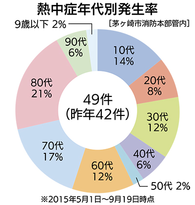 茅ヶ崎市消防本部によれば、5月1日から9月19日現在までに茅ヶ崎市内で発生した熱中症による救急搬送は49件。前年(42件)に比べ2割ほど微増した。