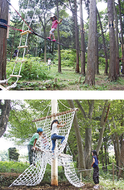 新設したのは、周囲を取り巻く森林の雰囲気にマッチしたアスレチック遊具。高さ1・8m程の「つり橋」は、全長12mを一本のワイヤーで渡るもの。公園内で自生した木がこの橋を支え、安全のため落下防止のネットが張られている。「えぼしツリー」は高さ3m。左右に伸びた丸太2本からネットがらせん状に張られて木登り体験が楽しめる。
