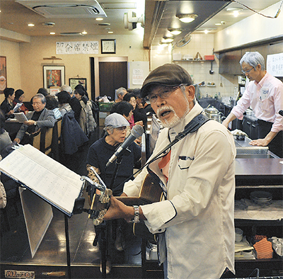 堤在住の西信光さん(75)が12月4日、雄三通りの茅ヶ崎珈琲店(【電話】0467・58・6077)で150回目の歌声ライブを開催した。