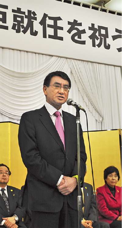 河野太郎代議士の国務大臣就任を祝う会(福澤正人実行委員長)が12月26日、大磯プリンスホテルで開かれた。平塚市や茅ヶ崎市、大磯町、二宮町の首長をはじめ、政財界関係者、支援者ら約780人が出席した。