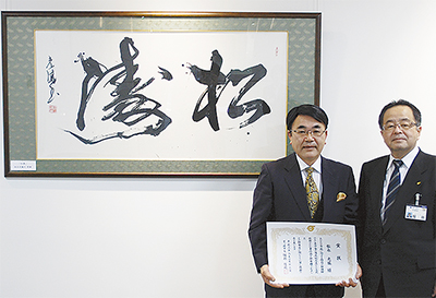 書道家の松永光鳳さん=茅ヶ崎市浜之郷在住=に、このほど市から感謝状が贈られた。これは新庁舎開庁に合わせ、茅ヶ崎市書道協会会長でもある松永さんが書を市に寄贈したことから感謝状が贈られたもので、作品は新庁舎2階、指定金融機関派出所前に展示されている。