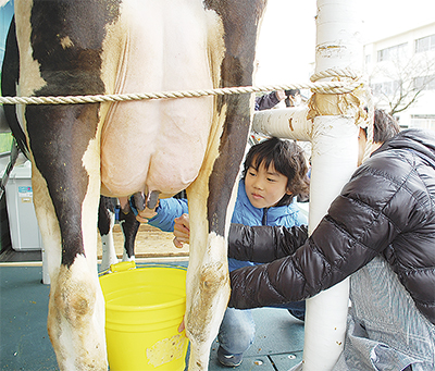 5年生は搾乳体験車に乗った大きな乳牛を相手に実際の搾乳を体験。一人ずつ体験車に乗り込み、畜産会の人の付添いを受けながら、恐る恐る手を伸ばして乳搾りを行った。牛に触るのは初めてという子どもたちばかりとあって、最初はこわばった表情だったが、終わった後はみなほっとした笑顔を見せていた。子どもたちは初めての搾乳体験に「楽しかった」「あったかかった」などと嬉しそうに話していた。