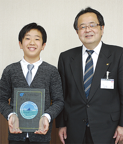 竹山輝(てる)君(12)=茅ヶ崎市中島在住=に茅ヶ崎市特別表彰が贈られた。これは、竹山君が昨年柳島小6年時に「第33回全国小・中学生作品コンクール」の理科部門で、最優秀賞にあたる文部科学大臣奨励賞を受賞したことを受けたもの。