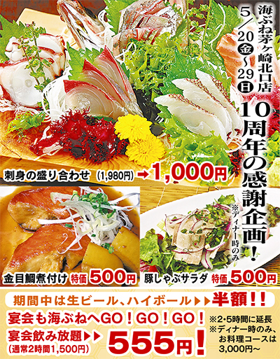 地元の新鮮食材をふんだんに使用した漁師料理で人気の「海ぶね茅ヶ崎北口店」がオープン10周年を記念したフェアを本日5/20(金)〜29(日)の期間限定で開催する。