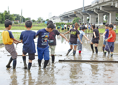 この日は初めに塾長の鈴木國臣さんから「代掻きは田植え前の大切な仕事。今は機械で行うことが多いですが、今日は人力でやってみましょう」と説明を受け、作業を開始した。ぬかるむ田んぼに初めて入る子どもが多く、はじめは「怖い」「深い」と恐る恐る足を入れていたが、その感触に慣れてくると皆歓声を上げながら土を踏み砕いていった。その後、ロープのついた平板を4人一組で力を合わせて引き、田んぼの凹凸や足跡を平らにならして行った。