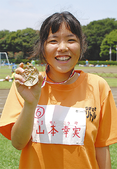 今大会の6年女子100mには県内から62人が出場し、予選を勝ち上がった8人が決勝レースで優勝を争った。山本さんはスタート直後こそ3番手に甘んじたものの、後半から追い上げる得意の走法で、前を走る2人を抜き去り一気にゴール。2位と0・22秒差をつける14秒13で全国への切符を手にした。