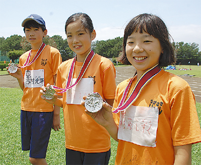 銀メダルを手にしたのは、共通男子走り高跳びの吉村光輝君(松浪小6年)、共通女子走り高跳びの坂間茉奈さん(柳島小6年)、ジャベリックボールの杉原しずくさん(同6年)。3人は強い風雨にさらされる悪天候の中、いずれも普段の練習以上の好成績を出して入賞を果たした。