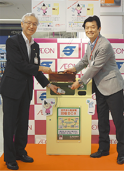 今月2日にはイオン茅ヶ崎中央店で小型家電回収開所式が開かれ、夜光広純茅ヶ崎副市長と佐藤大イオンリテール(株)南関東カンパニー神奈川事業部長がデモンストレーションを行った。