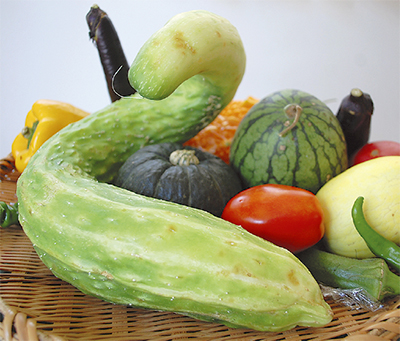 柳島在住の嵯峨野廣輔さんが、7月28日にヘビのような形をしたキュウリを収穫した。嵯峨野さんは自宅の近所の家庭菜園でキュウリやナス、トマトなどの野菜を30年ほど育てているが、このような野菜を目にしたのは初めてという。「先端に蛇の舌のように見える細い髭が1本あるところが可愛らしく気に入っている」と話し「『おばけキュウリジャー(蛇)』」と名付けて他の野菜と飾って家族で見て楽しんだ」と続けた。