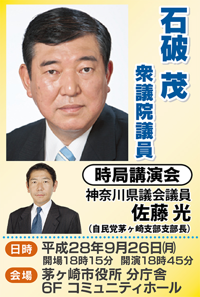 衆議院議員の石破茂氏を招いた自民党茅ヶ崎市連合支部の時局講演会が、9月26日(月)に開催される。