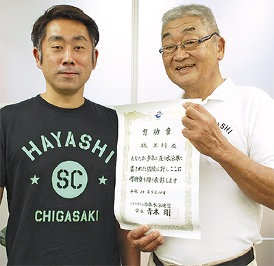 林正則さん(66)=茅ヶ崎市浜須賀在住=が、岩手県で開催された国体水泳競技会期間中の9月10日に日本水泳連盟の「2016年度有功章」を受章した。また息子の正基さん(40)は同競技会に神奈川県選手団青年の部の監督として携わり、初の総合2位に導いた。