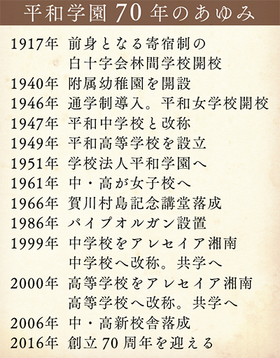 平和学園は1917年に設立された寄宿制の児童養護施設「白十字会林間学校」を前身に、国際的な平和活動でノーベル平和賞の候補にもなった初代理事長の賀川豊彦氏と初代校長の村島帰之氏の2人がその礎を築いた。46年に「平和女学校」として開校。私立学校法の施行で51年に「学校法人平和学園」となり、幼稚園から高等学校までの一貫教育をスタートさせた。61年から中・高を女子校としていたが99年に中学校、2000年に高校を共学に戻し、校名もギリシャ語で「真理」を指す「アレセイア」に改称した。
