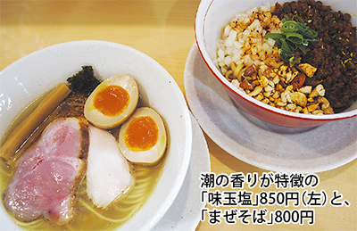 カキなど3種類の貝をベースにしたスープの「塩ラーメン」は、茅ヶ崎らしい潮の香りが特徴。さらりと食べられる細麺で、トッピングには岩のり、しっとりした舌触りの鶏胸肉、低温調理の特製チャーシューなど、店主のこだわりが光る。「まぜそば」は、うどん用の切り歯で製麺したモチモチの太麺を使用。辛さだけでなく甘味もある特製のラー油と粗挽き肉、3種のナッツ、玉ねぎ、そして高知県仁淀川産の山椒をプラス。具材と麺が絶妙に絡まり合う、食べごたえのある逸品だ。残った具材はライスにのせ、丼ぶりにしても楽しめる。また、醤油ラーメンやシュウマイ、ビールなども揃えている。店内はおしゃれな内装で、女性客や家族連れも入りやすい。化学調味料不使用な点も安心だ。