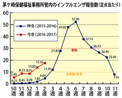 県内の保健所を通じて346カ所の医療機関からのインフルエンザ報告数をまとめている県衛生研究所では流行の目安を、各保健所管内の報告数が定点当たり1人以上で「流行開始」、10人以上で「注意報」、30人以上で「警報」としている。今冬、神奈川県全体では46週(2016年11月14日〜20日)の時点で流行開始となり、12月中に注意報が発令された。2週(17年1月9日〜15日)には県内で5734人(定点当たり16・67人)の報告があった。