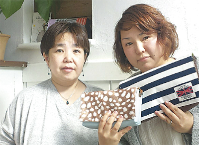この作品展は琉球ガラスを使ったアクセサリー作家・今野早苗さん(東海岸北)と布小物作家・鈴木ひを里さん(行谷)のコラボ展。カフェ内には、今野さんが沖縄で集めた琉球ガラスやホタルガラスを使ったアクセサリーと、鈴木さんによる色や素材にこだわった一点物の「大人ポシェット」などの作品約40点が並ぶ。