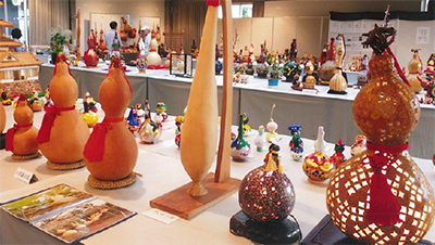 今回で29回目を迎える同作品展。会場にはひょうたんに装飾を施した会員の力作のほか、小出小学校3年生児童やひかりの子幼稚園園児が手掛けた作品が並ぶ。また、ひょうたん、房、紐、栓、ストラップなどの販売も行う。
