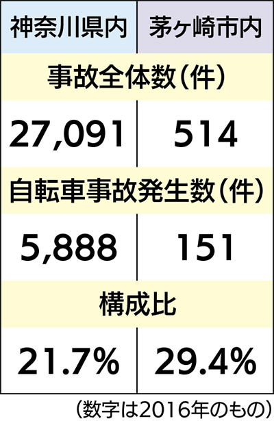 昨年の神奈川県の交通事故全体数は2万7091件で、このうち自転車事故の件数は5888件と21・7%を占めた。茅ヶ崎市では全体数514件のうち151件が自転車事故で29・4%になった。