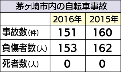 茅ヶ崎市内で発生した2016年中の全事故の負傷者数は588人、死者数は1人。このうち自転車事故での死亡事故は0件、負傷者数は153人で、全事故の26%を占めた。
