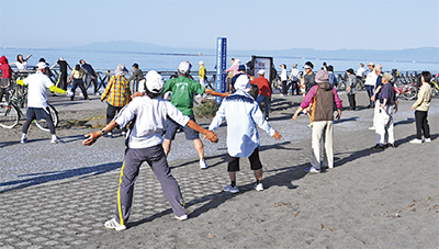 会場は相模湾を正面に、東に江の島、西に富士山やえぼし岩が望める絶好のロケーション。2年半前から参加している上野孝さん(70)は「天気の良い日には大島まで見える。早朝のおいしい空気と、いつでもこの時間に行けば本多さんやみんなと会えるということ。なにより誠実で、老いてなお元気な本多さんの存在が参加者を海岸へと駆り立てるのでは」と会の魅力を語る。体操会で育まれた参加者のつながりは、月1回有志で開くウォーキングイベントが、これまでに50回近くも行われていることに表れている。