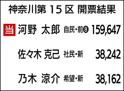 第48回衆院選は10月22日投開票され、神奈川15区では、自民党前職の河野太郎氏(54)が全国の小選挙区で最多の得票数を獲得し、8期連続の貫録勝ち。新人2氏を寄せ付けなかった。