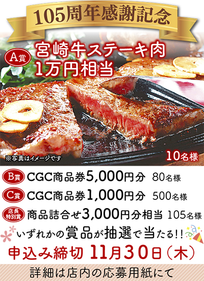 目玉はA賞のバイヤー厳選の宮崎牛ステーキ肉1万円分。ほか商品券など豪華賞品が当たる。