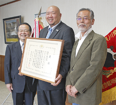 11月6日、吉田雅章さんと市畜産会の柿澤博会長が市役所を表敬訪問した。服部信明市長は「身近に農業を営む人がいることを知ってもらえる機会。茅ヶ崎にとって名誉なこと。今後も活躍してもらえたら」と労い、柿澤会長は「吉田さんの技術と、サポートする畜産会のメンバーの力があって良い成績が残せた。会員数は減っているが、協力を密にしていきたい」と語った。吉田さんは「当初、市に出品しようと思っていた牛の体調が悪くなり別の牛を出品したので、今年はまさか受賞できるとは思っていなかった。『チーム茅ヶ崎』で取れた賞だと思う。来年の大会も良い成績を目指していきたい」と話した。