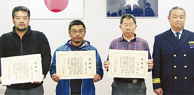 表彰者は石坂俊幸さん、石井満夫さん、大塚亮太さん。11月3日午前8時45分ごろ、3人は港出入り口付近の岩に接触して漂流していた40代男性のカヌー乗船者を発見。船を近づけて石坂さんが男性の手を取って船に乗せ、大塚さんがカヌーを船内に引き上げた。石井さんは仲間が救助活動をしやすいよう、見張りをしながら操船を続けた。3人は「海の男として二度とこのような事故が無くなることを願う」と話した。