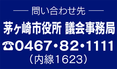 神奈川県茅ヶ崎市茅ヶ崎1-1-1茅ヶ崎市役所内議会事務局内線1623