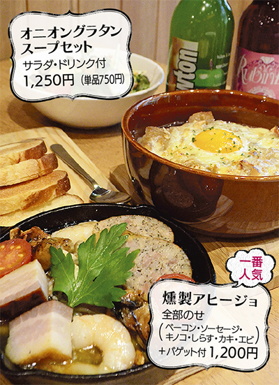 明るくお洒落な店内は女子会や夫婦などで賑わっていた。ランチの女性一番人気はオニオングラタンスープセット(1,250円)。リピーター率断トツなのはアヒージョだ。