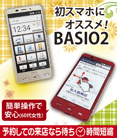 同店小宮店長オススメの初スマホは「BASIO2」。初スマホユーザー向け仕様で、メールや電話着信対応ボタンや、防水・防塵、拡大鏡機能、通話機能にはノイズキャンセラー・音声強調機能つき。カメラには美肌補正モードまで。「iphoneもキャンペーン該当機種です。いずれの機種も店頭で触っていただけます。お気軽にご来店下さい」