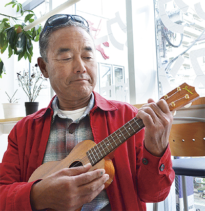 「茅ヶ崎に似合う音だよね」。そう話すのは、日に焼けた肌に白い歯、頭にはサングラス、赤い上着を羽織って軽やかにウクレレを奏でる中村龍男さん(63・柳島海岸在住)。周囲からは「これぞ茅ヶ崎シニアという歳の取り方」と評されるが、本人はいたってマイペースだ。