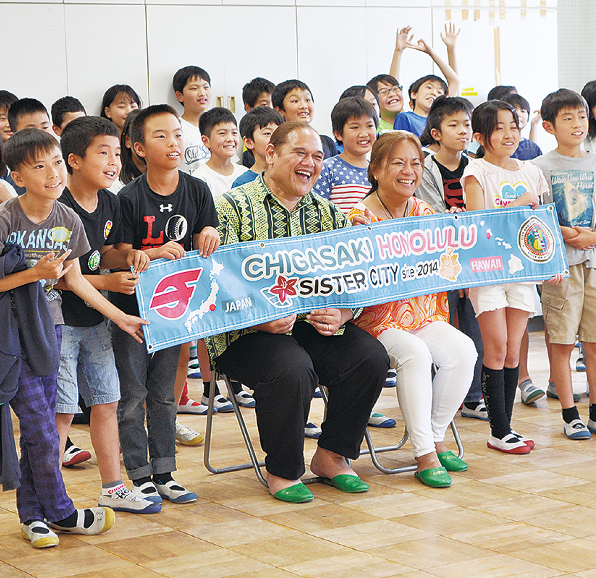 5年生約140人が2回に分かれて参加した授業ではハワイ賛歌「Hawai'i Aloha」の歌詞を通して、自然への感謝や人と人とのつながりを大切にする「アロハスピリット」を学習。イライアスさんのウクレレ演奏に合わせて児童たちが輪になって歌い、記念撮影や給食をともにして交流を深めた。イライアスさんは「子どもの反応が最高。楽しく思いを伝えられた」と振り返り、5年1組の山口隆(りゅう)君は「ハワイの歌を初めて聞いてハワイをもっと知りたくなった」と話した。