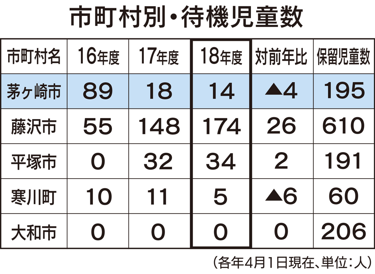 神奈川県は6月8日、保育園利用などに関する2018年度の待機児童数を発表した。県全体では2年連続の増加となった一方、15年・16年度に県内ワーストの待機児童数だった茅ヶ崎市は、前年より4人減り14人に。重点課題として“ゼロ”に向けて取り組む市の動向を探った。