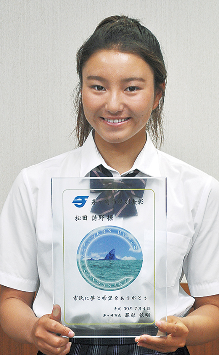 松田詩野さん(15)=東海岸南在住=に対して、7月4日に茅ヶ崎市特別表彰が贈られた。5月下旬に開催された「サーフィン国際大会一宮千葉オープン WQSツアーグレードQS1000」で優勝したことを受けたもの。同大会はプロ最高峰チャンピオンシップツアー(WCT)の予選シリーズ(WQS)。会場の千葉県釣ケ崎海岸は2020年の東京五輪の会場でもあり「割れるのが早い苦手な波を攻略できた。五輪会場で勝てたのは自信になる」と振り返った。