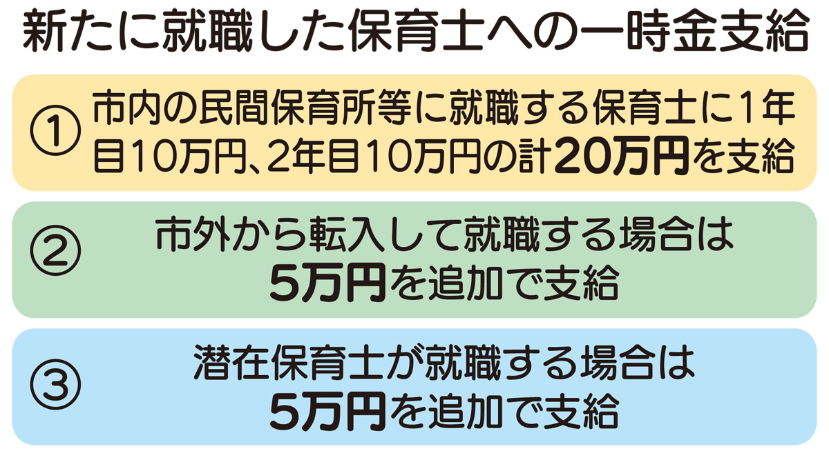 「待機児童をゼロにするには、もう一歩踏み込まないといけない」。市保育課の西山和志課長補佐(44)は、保育士への一時金支給に踏み切った理由をこう語る。