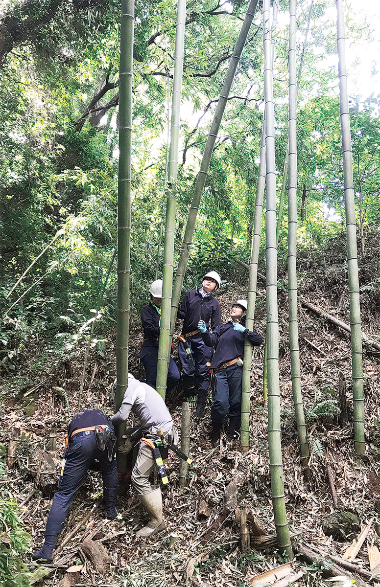 今回伐採したモウソウチクは直径約20cm、高さは25mを超えるものもある大型種。同園は里山景観保全活動として、竹林エリアを設け、春の筍掘りや竹炭作りなどの自然体験にも活かしている。しかし竹は繁殖力が高く、放っておくと周囲の雑木林なども竹林と化してしまうこともある。近年、エリア外での竹の繁殖が極度に進行。特に山の斜面の侵食が目立ち、老竹が倒れる危険性もあったことから、大規模な伐採作業を行うことになった。