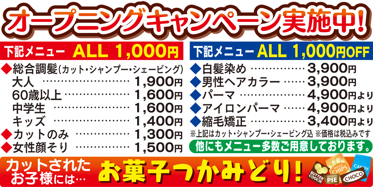 また「キッズルーム」や、DVDを観ながらカットできる「スポーツカー席」=写真右端=などを完備し、子どもと一緒に散髪できるのも嬉しい限り。今なら本紙を持参すれば特典イッパイのオープニングキャンペーンも実施中(期間限定)なのでぜひ一度、気軽に足を運んでみては?