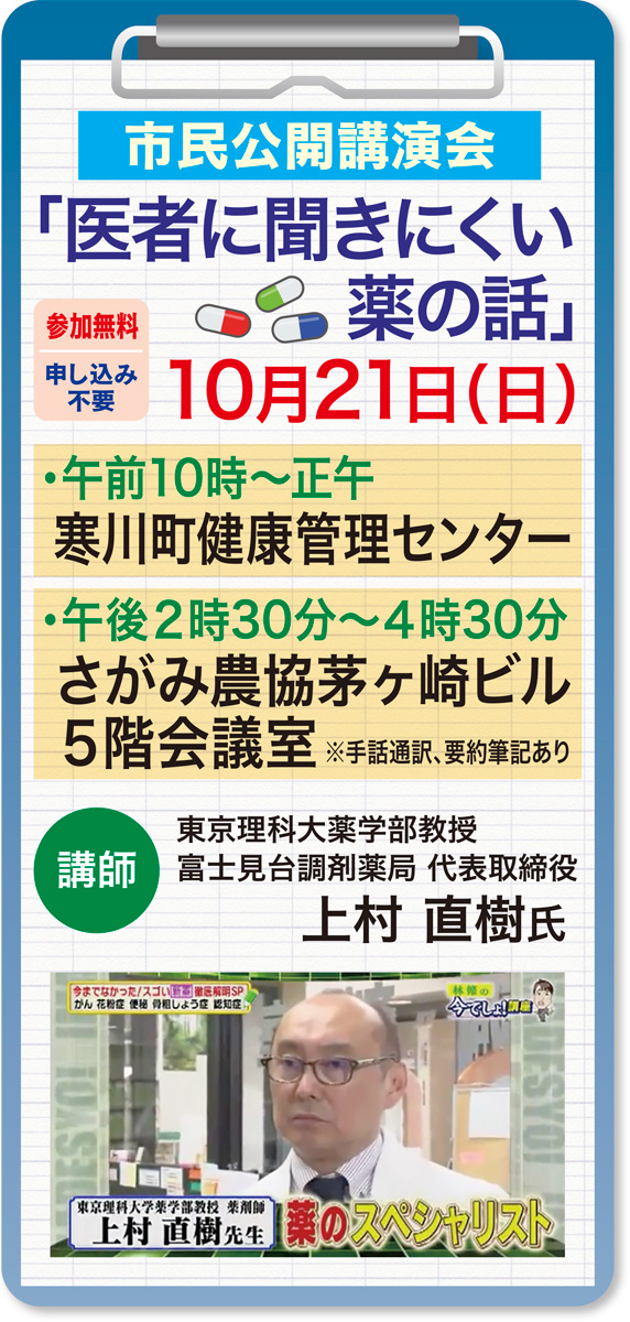 茅ヶ崎寒川薬剤師会主催の第7回市民公開講演会「医者に聞きにくい薬の話」が10月21日(日)に2会場で開かれる。午前10時から正午まで寒川町健康管理センター、午後2時30分から4時30分までさがみ農協茅ヶ崎ビル5階会議室。申込不要で入場無料。各会場当日先着100人。茅ヶ崎会場は手話通訳・要約筆記あり。