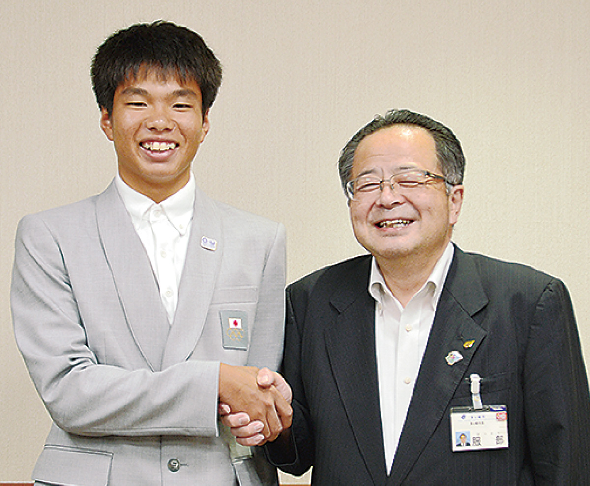 3年前に市特別表彰を受賞して市長表敬訪問をした際、今後の目標に「ユースオリンピック日本代表」を掲げていた池田君。今回市役所を訪れ服部信明市長に「叶いました」と笑顔で報告すると、市長は「見事。自然相手の競技は大変だが、存分に頑張ってほしい」と激励した。