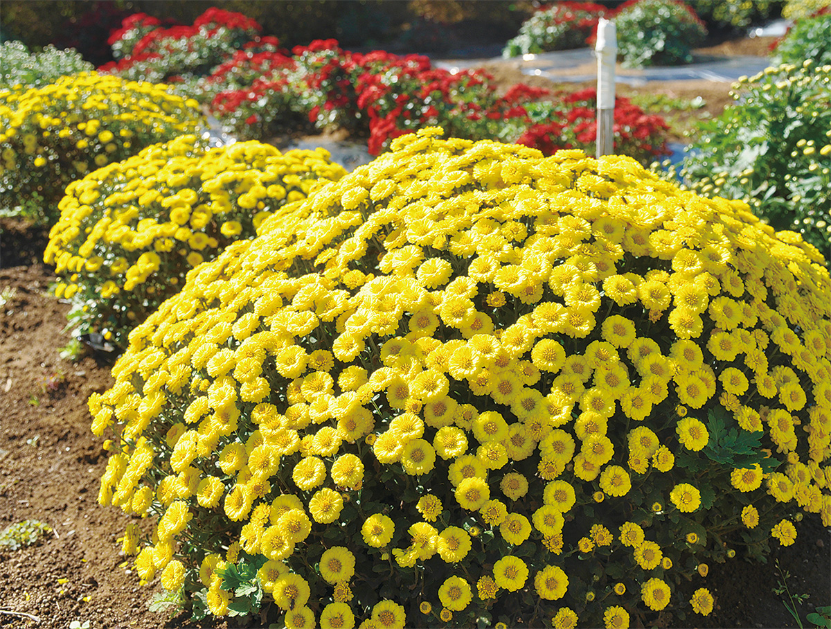 茅ヶ崎市の北西部を流れる小出川沿いで、ざるを伏せたような形の黄色や赤の「ざる菊」が開花し始めた。真っ赤に紅葉するコキア(ほうき草)とのコラボが楽しめる。