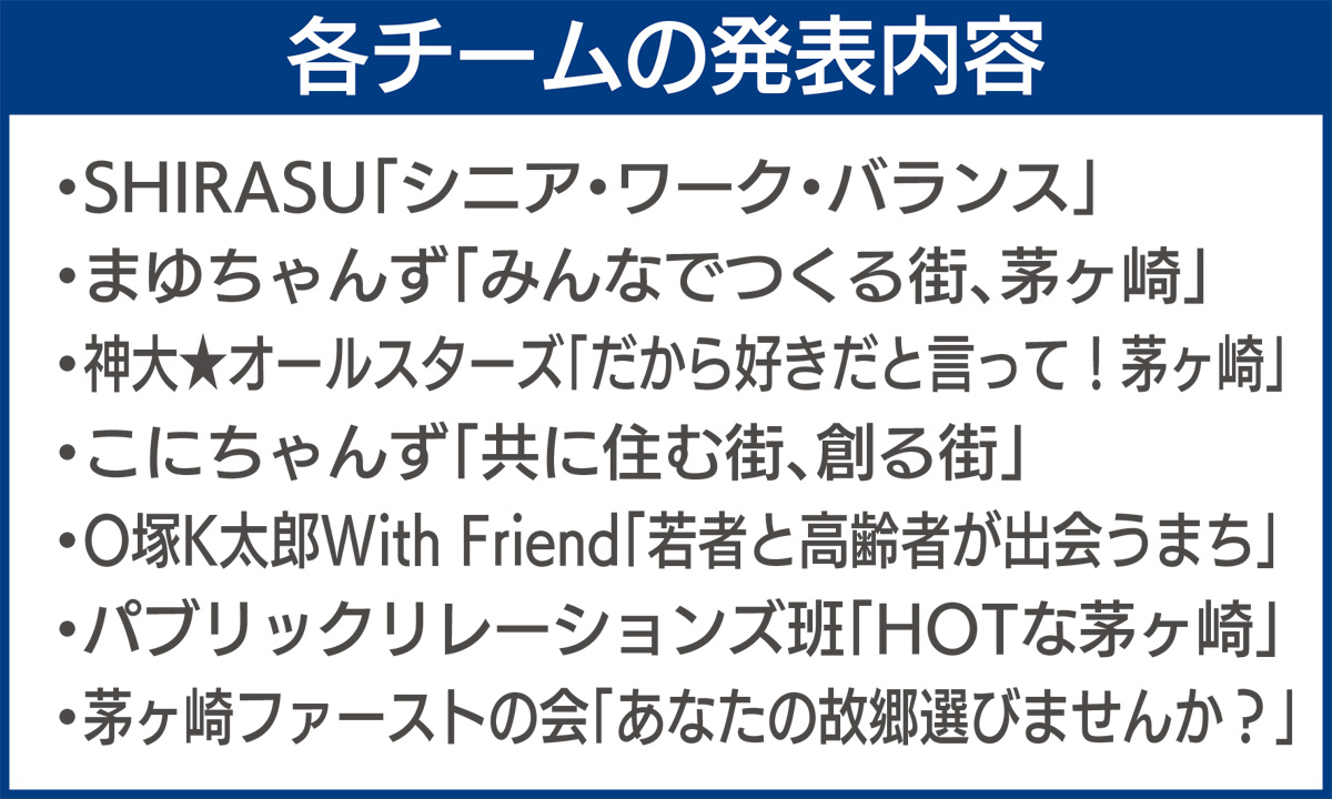 参加対象となるのは16歳から29歳までの若者たち。市内外の学生らで結成された7チームが参加した。各チームは9月のキックオフイベントから市内を散策するなどして市民へのアンケートやヒアリングを進めた。市政に関する参考文献などを考察し、理想となる茅ヶ崎像を念頭に政策を立案。10月に開催された中間報告での模擬発表を経て改良を重ね、今回の発表の場に臨んだ。