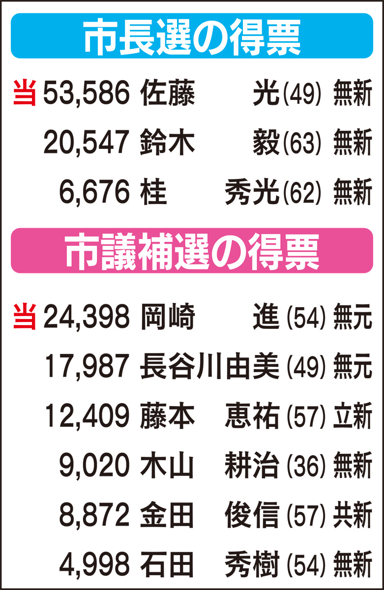 無所属で出馬した新人3人による三つ巴の戦いとなった市長選。「服部市政を継承しつつ進化させていきたい」と語って選挙戦に挑んだ佐藤氏=自民・公明推薦=は、中学3年生までの小児医療無償化や中学校給食導入といった子育て支援、市立病院の経営改革などを公約に掲げて5万3586票を獲得した。公共施設建設の見直しによる財政再建を主張した鈴木氏=立憲民主・自由・社民推薦、共産支持=は2万547票、市長の年俸半減などを訴えた桂氏は6676票と及ばなかった。
