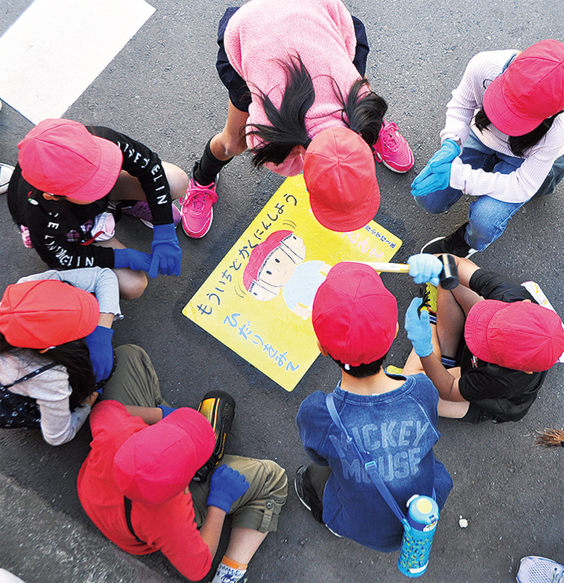 ステッカーは4クラスが1枚ずつデザインし、同小学校区内の交差点40カ所に設置。班ごとに分かれた児童らは保護者や市職員、地域の自治会員らとともに設置作業を行った。