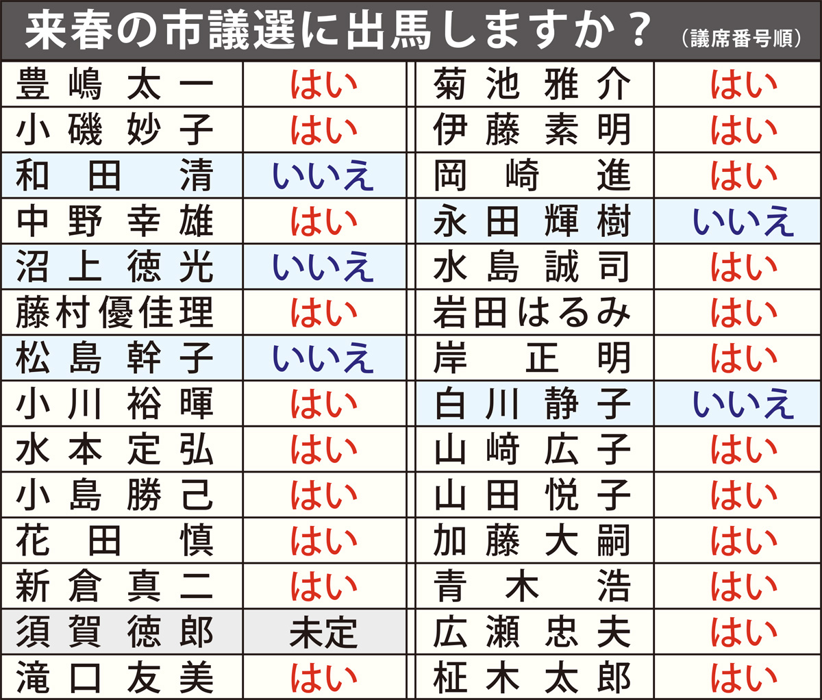 来年の市議選については、出馬予定と答えたのが28人中22人。未定が1人、出馬しないが5人だった=表参照。出馬しない方向の5人の中で、沼上徳光市議と永田輝樹市議は来春の神奈川県議会議員選挙へ立候補予定。白川静子市議は後継人を立て、和田清市議と松島幹子市議は後継人なしで不出馬とした。松島市議からは、12月末での辞職願が出されている。
